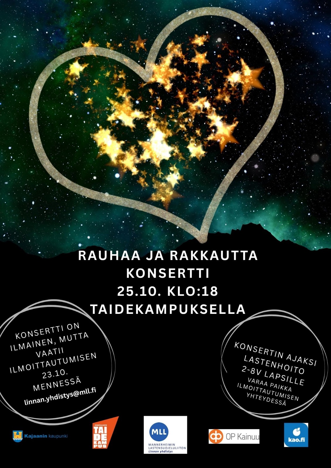 MLL Linnan yhdistys järjestää yhteistyössä Kainuun ammattiopiston, Kajaanin kaupungin, Seminaarin Taidekampuksen sekä OP Kainuun kanssa Rauhaa ja rakkautta -konsertin lauantaina 25.10.2025 klo 18 alkaen taidekampuksella. Tervetuloa nauttimaan loistavasta musiikista ja tunnelmasta. Taidekampuksen aulabaari palvelee tapahtuman aikana.