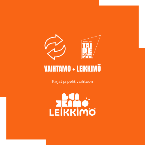Taidekampuksella toimii kiertotalouspiste Vaihtamo: Tuo mukanasi enintään 5 kirjaa, lautapeliä tai palapeliä – ja ota mukaasi yhtä monta kuin tuot. Vaihtamo edistää kiertotaloutta ja tarjoaa löytämisen riemua!