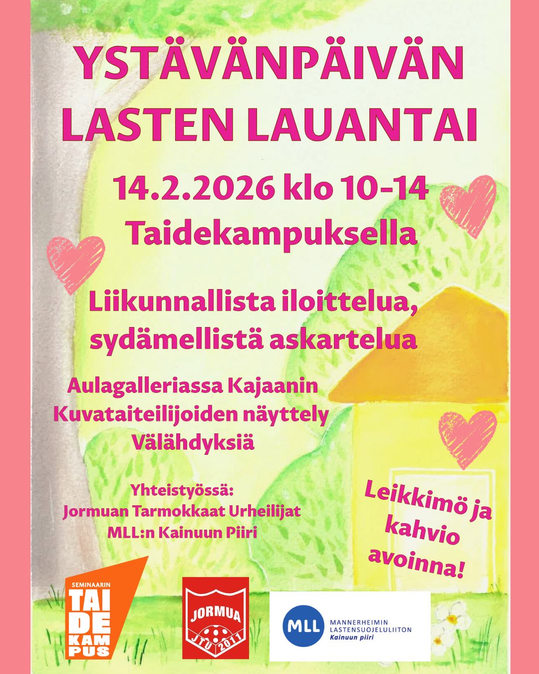 Helmikuun Lasten Lauantaissa juhlistetaan ystävänpäivää! Luvassa liikunnallista iloittelua ja sydämellistä askartelua: Jormuan Tarmokkaat Urheilijat parkkeeraavat temppukärrynsä Taidekampukselle, jonka aktiviteettien kanssa kaikenikäiset voivat temmeltää. Mannerheimin Lastensuojeluliiton Kainuun piirin kanssa osallistujat pääsevät askartelemaan Leikkimöön ystävänpäivän hengessä. Taidekampuksen aulagalleriassa on nähtäväillä Kajaanin Kuvataiteilijat ry:n näyttely Välähdyksiä. Tapahtumassa palvelee Taidekampuksen kahvio. Tapahtumaan on vapaa pääsy. Taidekampuksella (Satamakatu 3) La